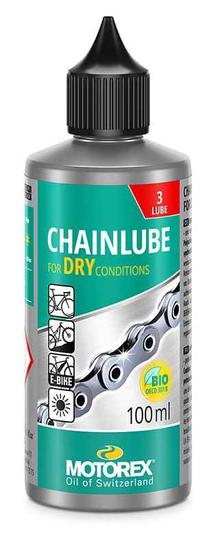 MOTOREX CHAINLUBE FOR DRY CONDITIONS est utilisé pour la lubrification de chaîne et de dérailleur sur toutes les bicyclettes par temps sec, notamment pour les VTT et la descente VTT.