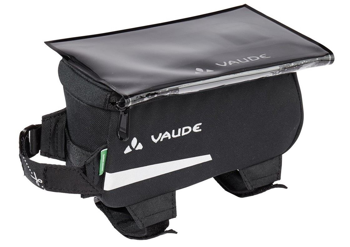 Sacoche pour le tube supérieur, pour ranger quelques provisions facilement accessible fixation à velcros avec porte-téléphone intégré à la fabrication écologique Agrandissez votre cockpit ! Cette sacoche compacte permet de ranger à portée de main la barre énergétique et un peu de monnaie ; elle est équipée d’une housse amovible et étanche à l’eau pour y ranger votre smartphone et suivre le GPS. Les deux sont faciles et rapides à installer. Le label Green Shape de VAUDE garantit des produits fonctionnels et écologiques en matières durables.