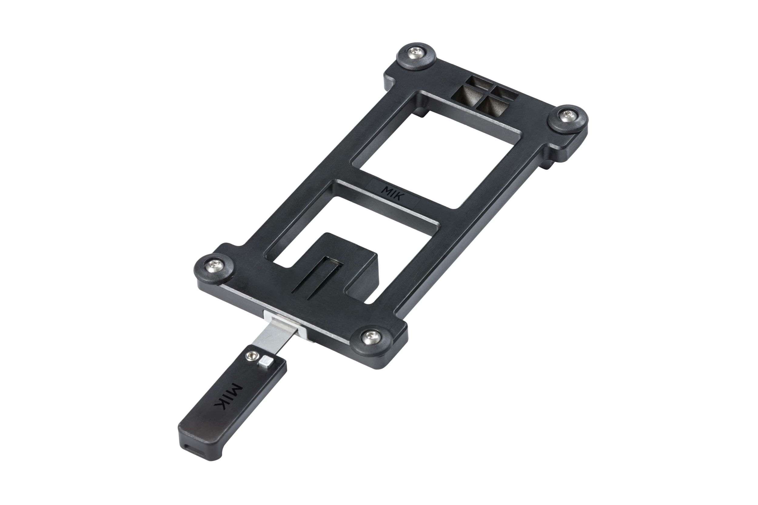 Plaque adaptateur, clé pour verrouiller inclu, compatible avec accessoires vélos amovible, compatible avec des porte-bagages équipé du système MIK ou MIK carrier plate (pas inclus), compatible avec e-bikes, noir.