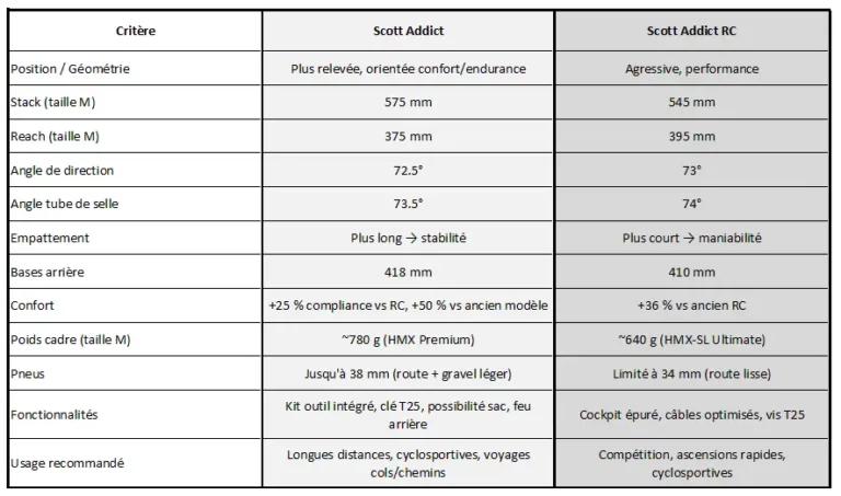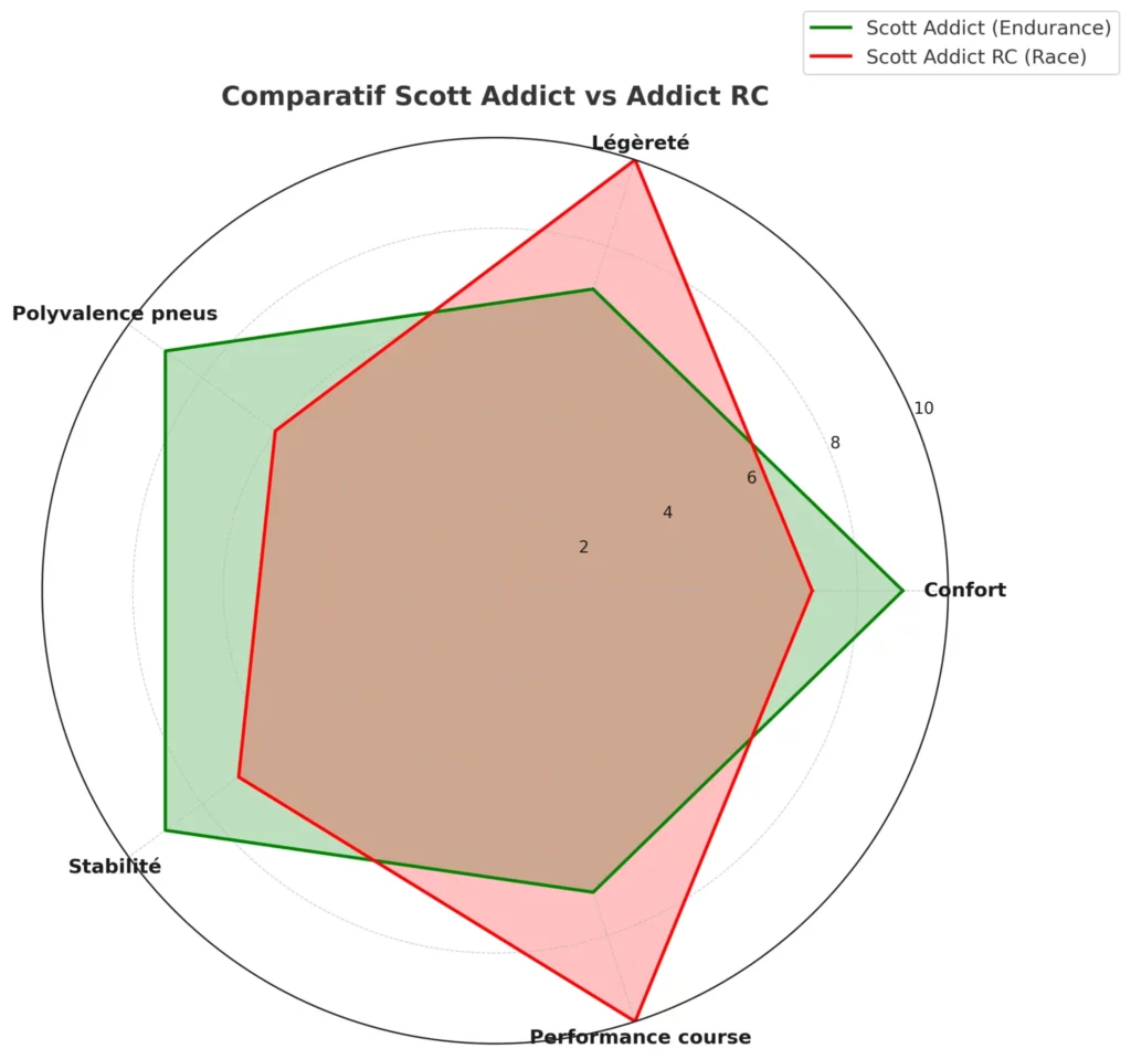 Le spider chart illustre bien cette opposition : l’Addict domine sur le confort et la polyvalence, tandis que l’Addict RC prend l’avantage sur la légèreté et la performance.